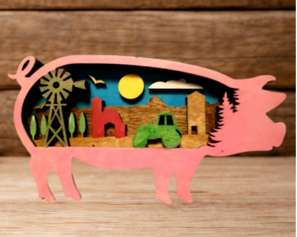 Elevate your farm-themed decor with our 4 layer lasered pig, a must-have for any enthusiast. The meticulous laser cutting process allows for intricate detailing and a stunning 3D effect on the pig's body. The pig boasts a tractor, barn, and windmill, all expertly laser-cut into the wood. Constructed from high-quality wood, it is the ideal size to display on a shelf, mantel, or wall. The natural wood grain confers a rustic charm on the piece, rendering it a unique and endearing addition to any home. Whether you have farming in your blood or simply adore farm-inspired decor, this lasered pig is certain to garner admiration. Please note that the colors may vary, enhancing its individuality.ed item in your home.