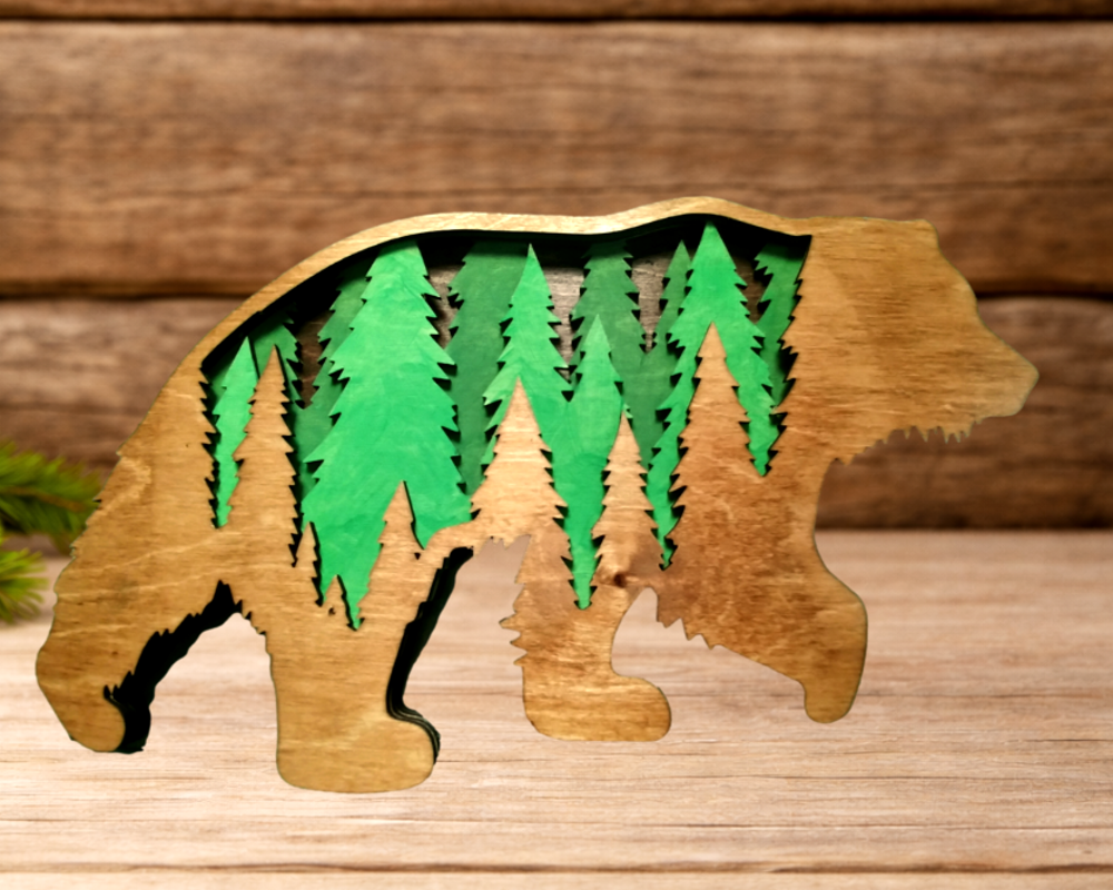 Introducing our exquisite 4-Layer Laser-Cut Bear - a must-have addition to any nature-themed decor. With its intricate laser cutting technique, the bear features precise detailing and a striking 3D effect on its body. The laser-cut trees layered inside the bear create a stunning visual effect. Crafted from premium quality wood, this bear is the perfect size to hang on any wall, adding a touch of rustic charm to your space. The natural wood grain accentuates the piece, making it a unique and delightful addition to any home. Whether you're a nature enthusiast or just appreciate the beauty of the outdoors, this Laser-Cut Bear is sure to impress. Please note that colors may vary.