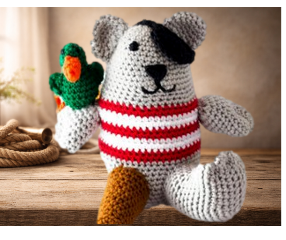 This stuffed bear is a fun peg legged pirate who has his own pet parrot! He also has a pirate patch that can be flipped up so he can see out of both eyes. This stuffed bear toy would make a perfect gift for kids of all ages. It could be used for Pirate decor for a bedroom or give it as a baby shower gift.