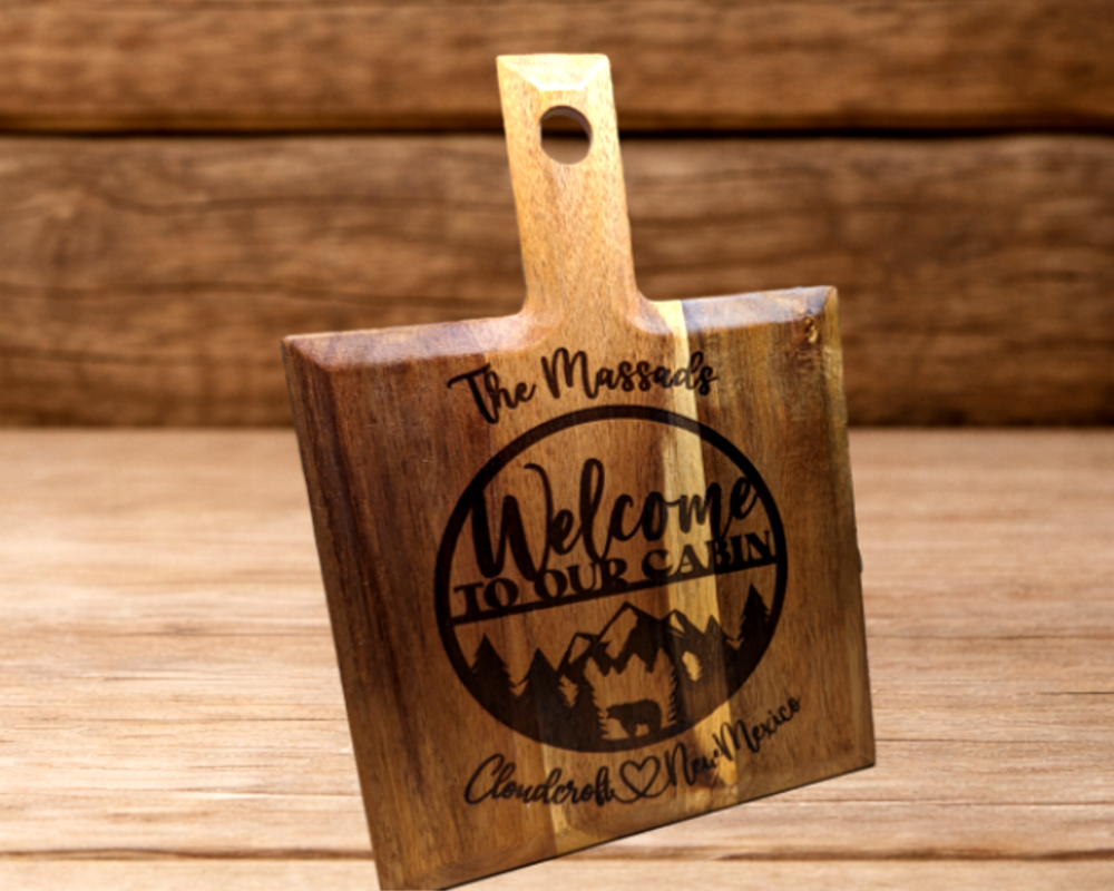 Crafted from durable and naturally beautiful acacia wood, this cutting board not only fulfills its practical purpose but also transforms into a cherished focal point in your cabin lifestyle. Whether you're chopping vegetables or entertaining guests, this personalized Acacia Cutting Board is a one-of-a-kind and considerate addition to your cabin sanctuary. Welcome home!